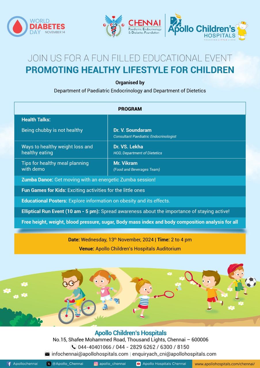 On November 13, 2024, the Chennai Paediatric Endocrinology and Diabetes Foundation, in collaboration with Apollo Children’s Hospital, organized a vibrant Diabetes Day program at Apollo Children’s Hospital, Thousand Lights, Chennai. The event spotlighted the alarming rise in type 2 diabetes mellitus among children and adolescents, primarily due to obesity, and aimed to promote awareness about prevention and healthy lifestyle practices.